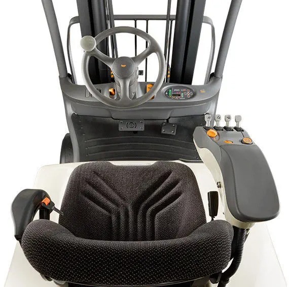 Ghế giảm xóc có chức năng quay 15 độ, giúp người vận hành cảm thấy thoải mái hơn khi điều khiển xe nâng theo hướng ngược lại (kéo càng nâng).